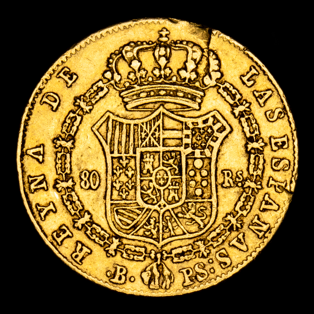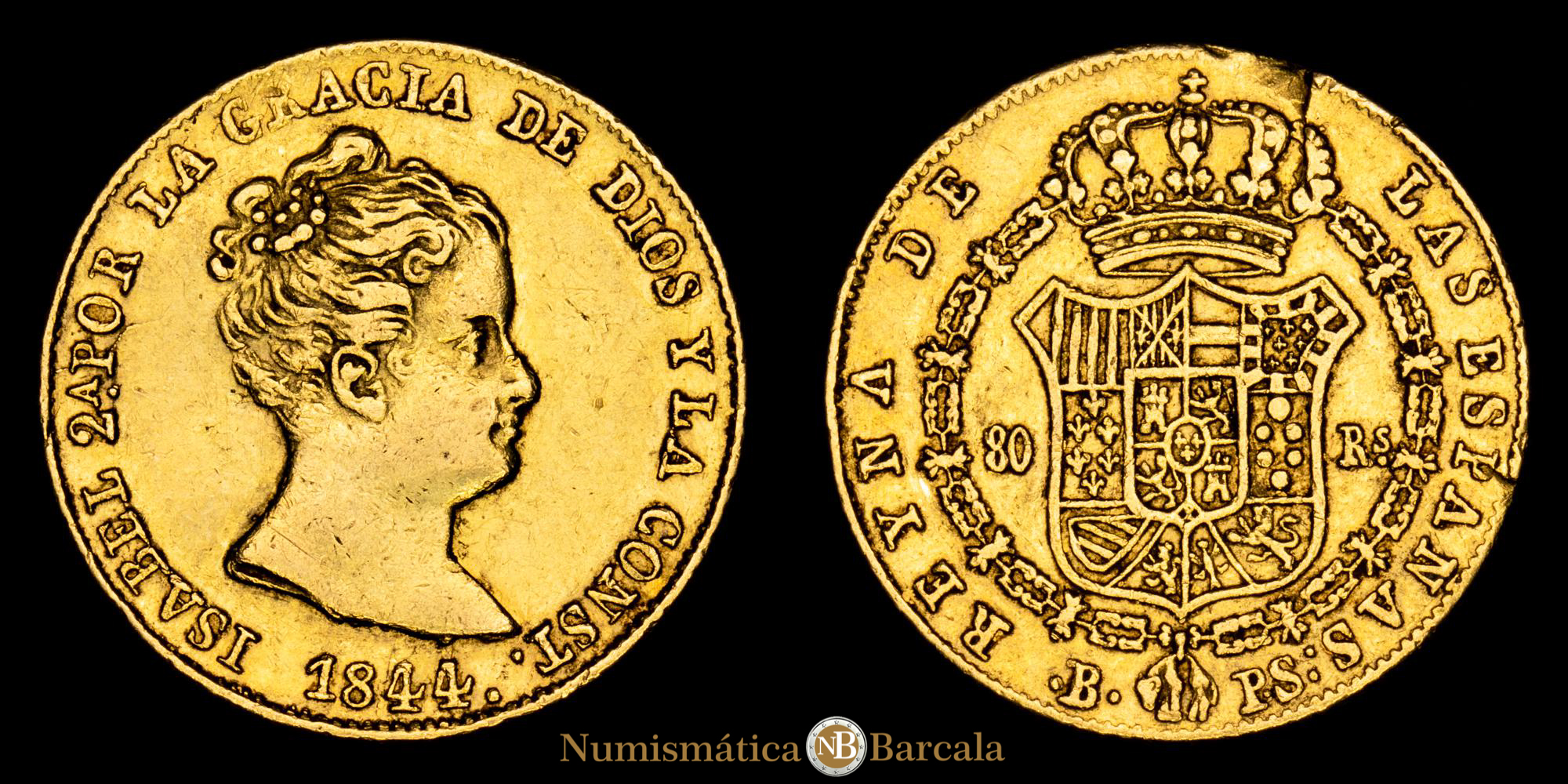 Numismática Barcala > Productos > Monarquia Española > Borbones > 1833-1868 Isabel II > Isabel II. 80 Reales. (6,71 g.). Barcelona. 1844. Ensayador P·S. Aureo y Calico-711. MBC+/MBC. Hoja en reverso