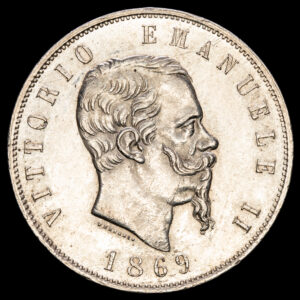 Italia – Vitorio Emanuel. 5 Liras. (25,1g.). Milano. 1869. KM-8.3. XF+.