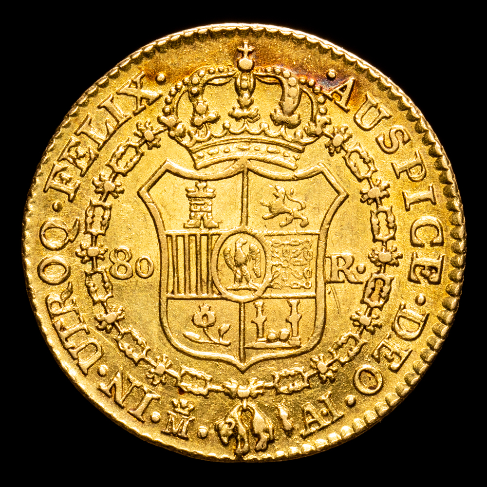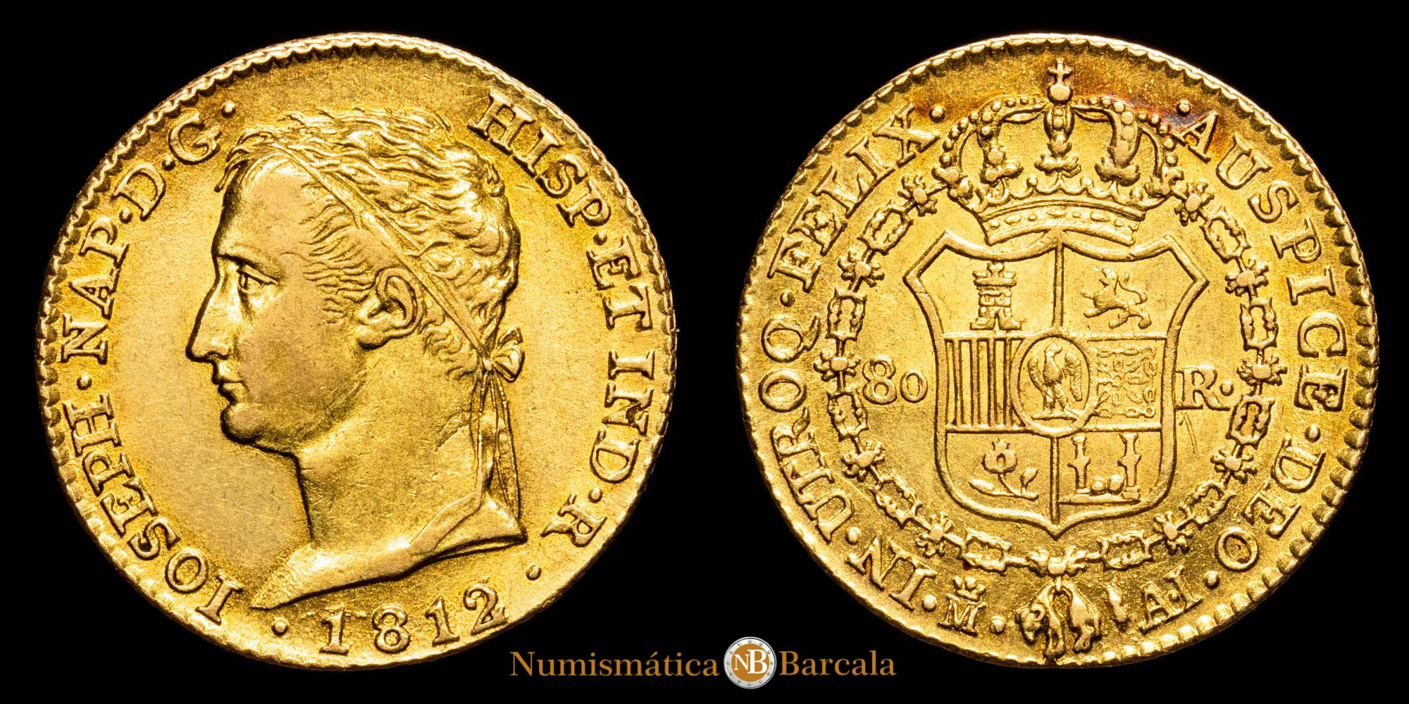 José Napoleón. 80 Reales. (6,81 g.). Madrid. 1812/1. Ensayador A·I. AC-50. EBC. Restos de brillo original. Rara