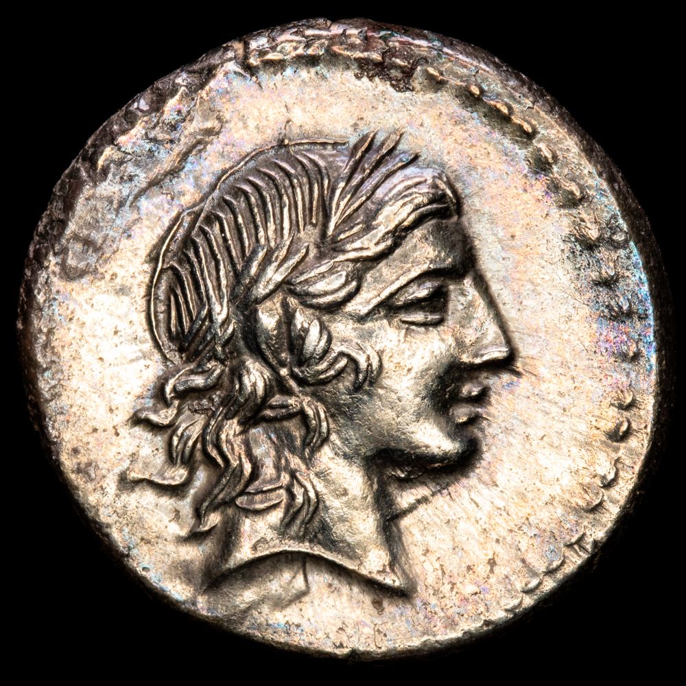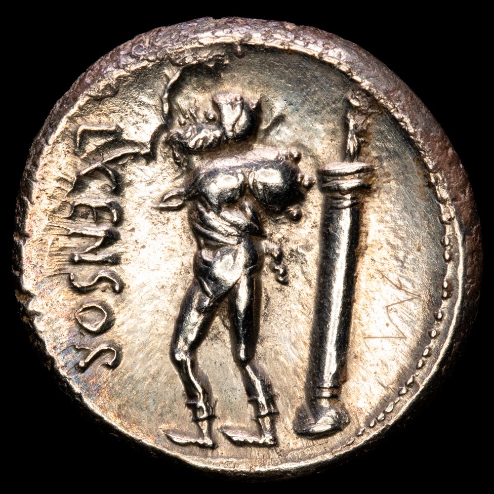 L. Censorinus. Denarius. Rome, 82 BC. 4,02 gr. Laureate head of Apollo right; ant control mark below chin / Marsyas standing left, holding wineskin over shoulder; to right, column surmounted by statue of Minerva (?) standing left; L•CENSOR downwards to left. Crawford 363/1b; RSC Marcia 24.XF+
