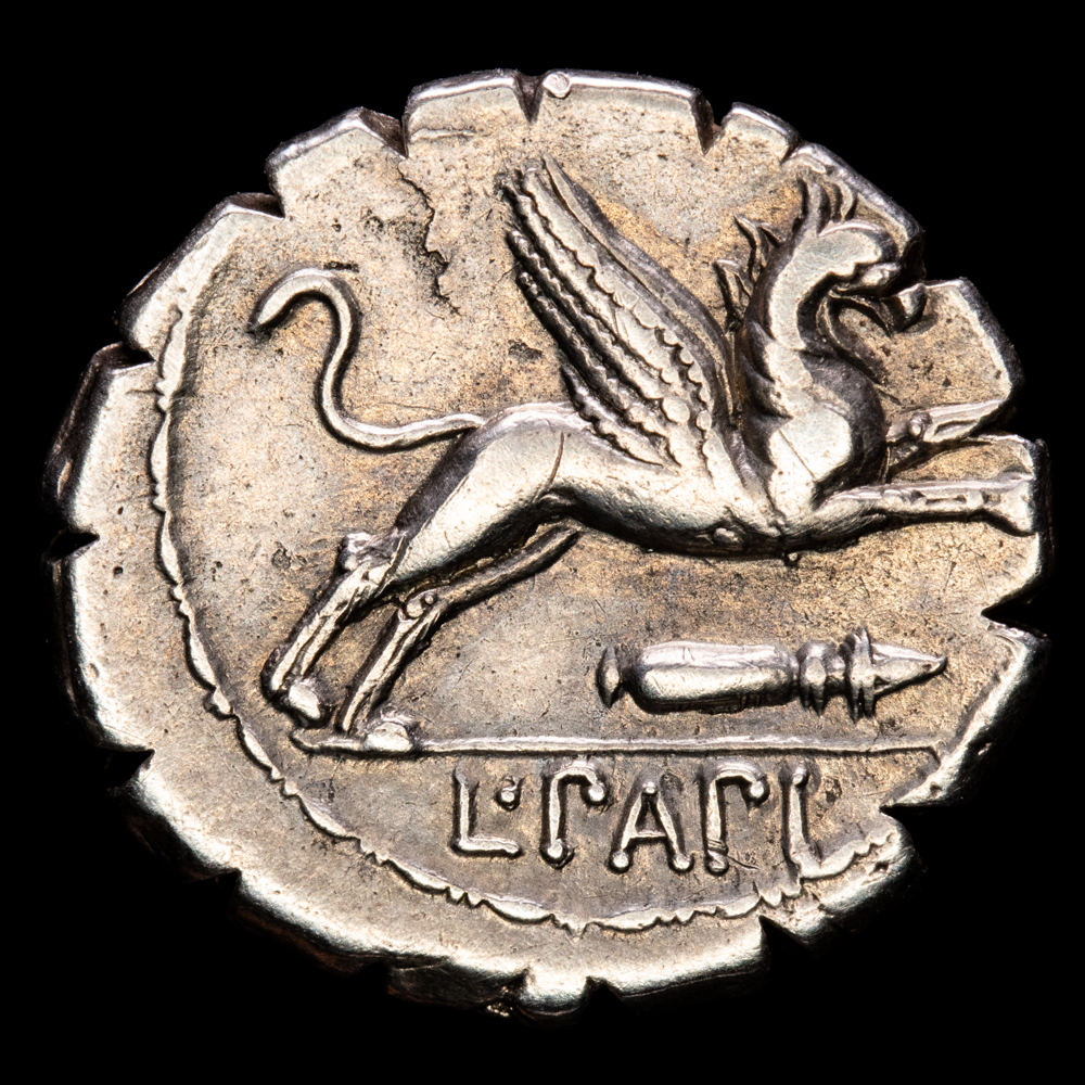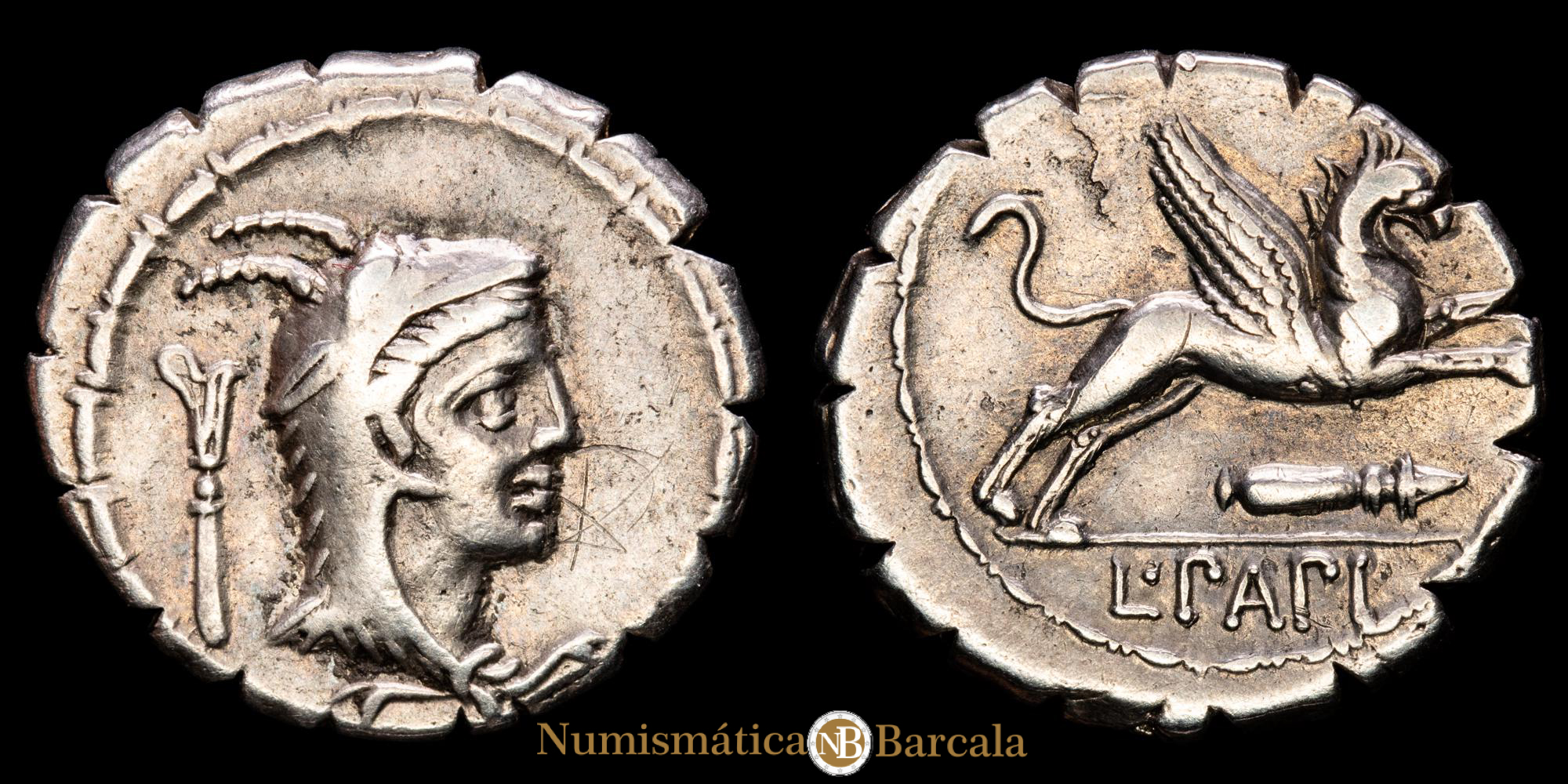 Numismática Barcala > Productos > Romanas > REPÚBLICA > L. Papius. Denario de plata (3,95 g.). Roma, 79 a.C. FFC-952. VF+