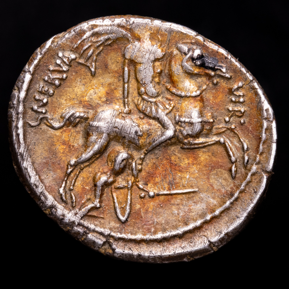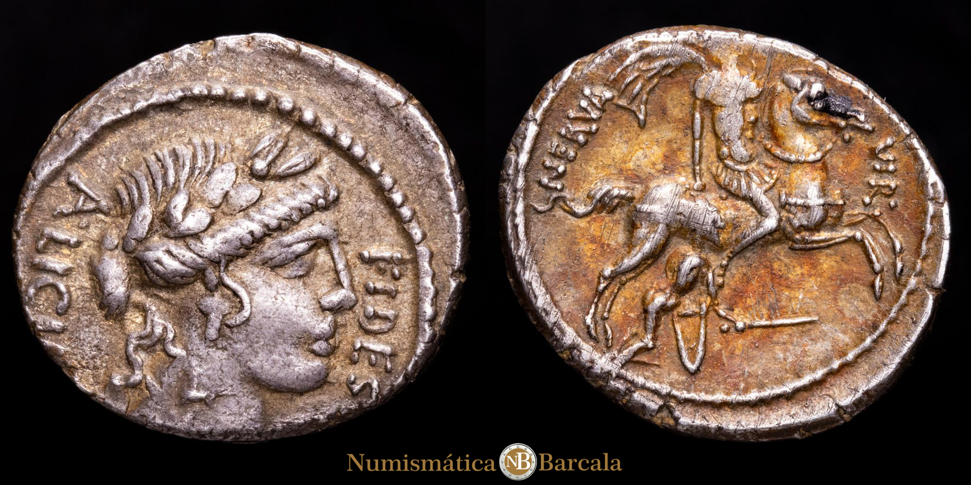 Numismática Barcala > Productos > Romanas > REPÚBLICA > Licinia. Denario. (3,92 g.). Roma. 47 a.C.. Craw-454/2. EBC-. Rara. R: NERVA III VIR