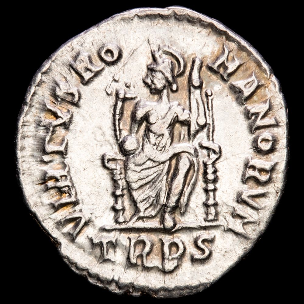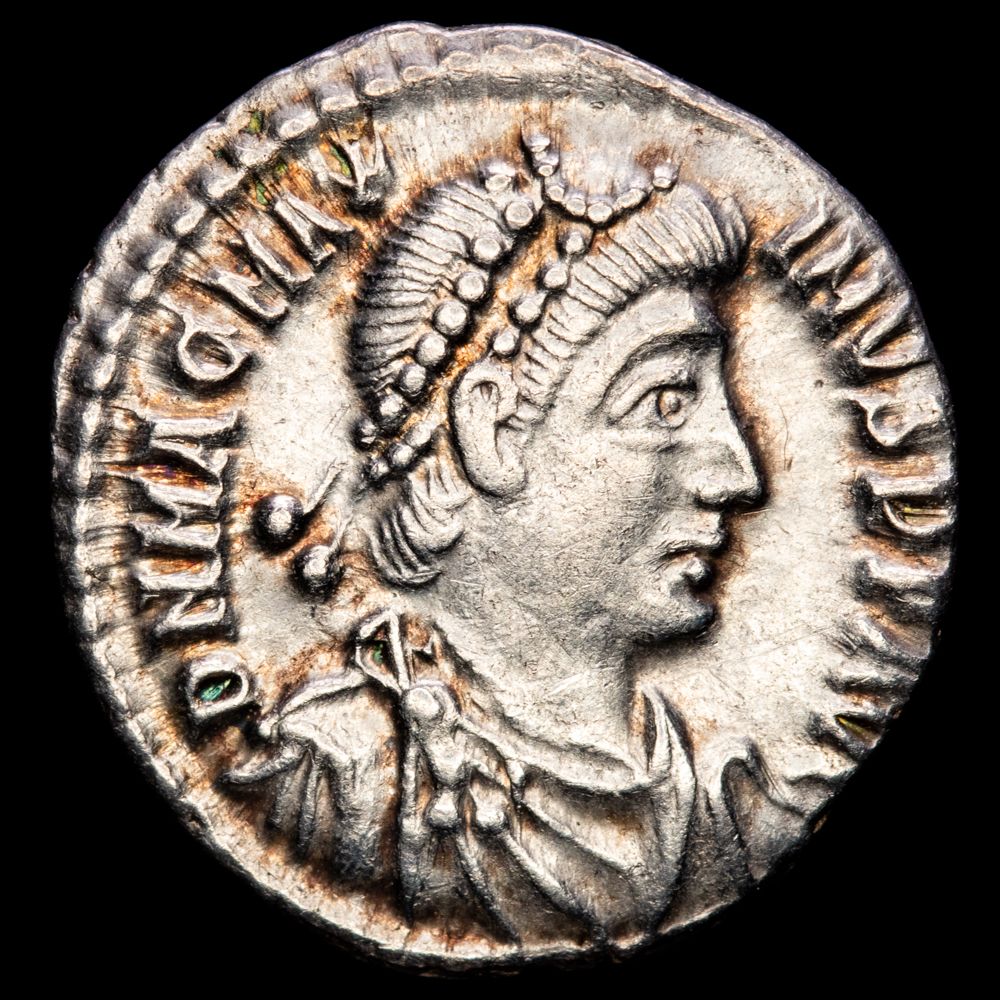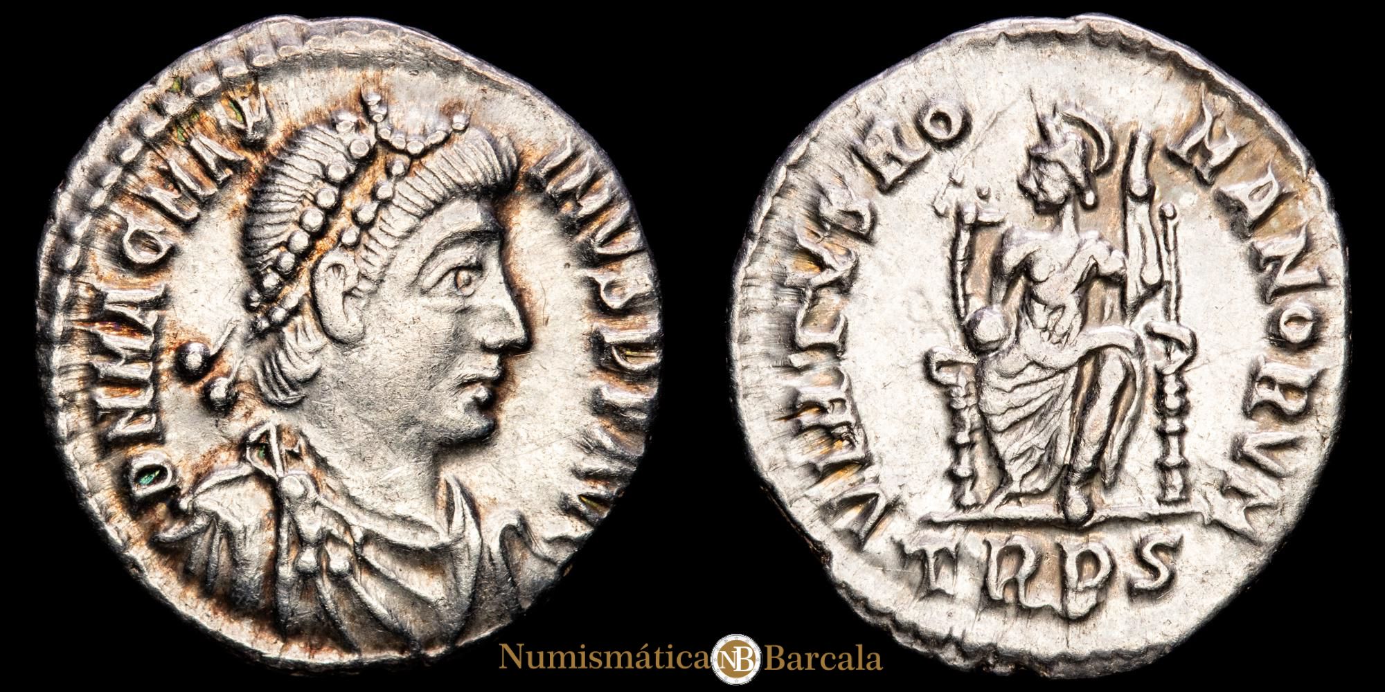 Magno Máximo. Silícua (1,60 g.). Acuñada el 383-388 d.C. Treveri. Anv.: D. N. MAG. MAXIMVS P. F. AVG. Busto diademado a derecha. Rev.: VIRTVS ROMANORVM TRPS. Roma sentada a izquierda. C-20b; RIC-84b. EBC-.
