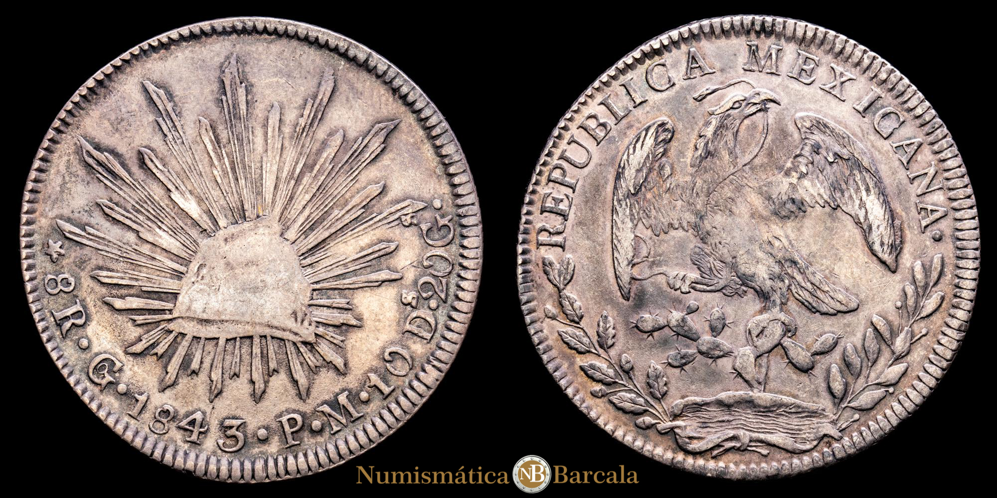 México. 8 Reales. (26,94 g.). Guanajuato. 1843. Ensayador P·M. KM-377.8. MBC+. Bella pátina.