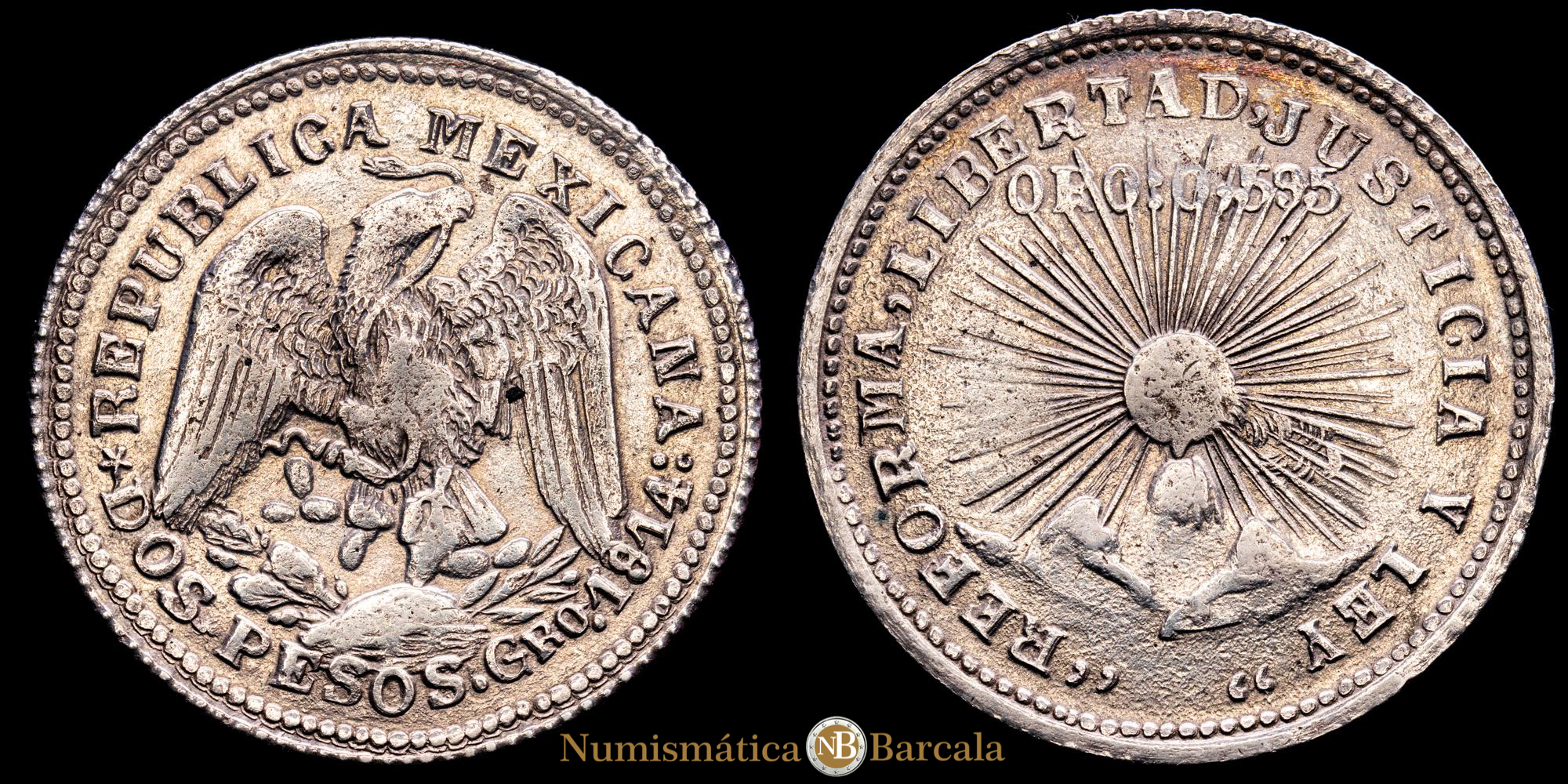 Numismática Barcala > Productos > Monedas Mundiales > América Central > México > México – Época Revolucionaria. 2 Pesos. (25,27 g.). Guerrero. 1914. KM-643. MBC+. Escasa