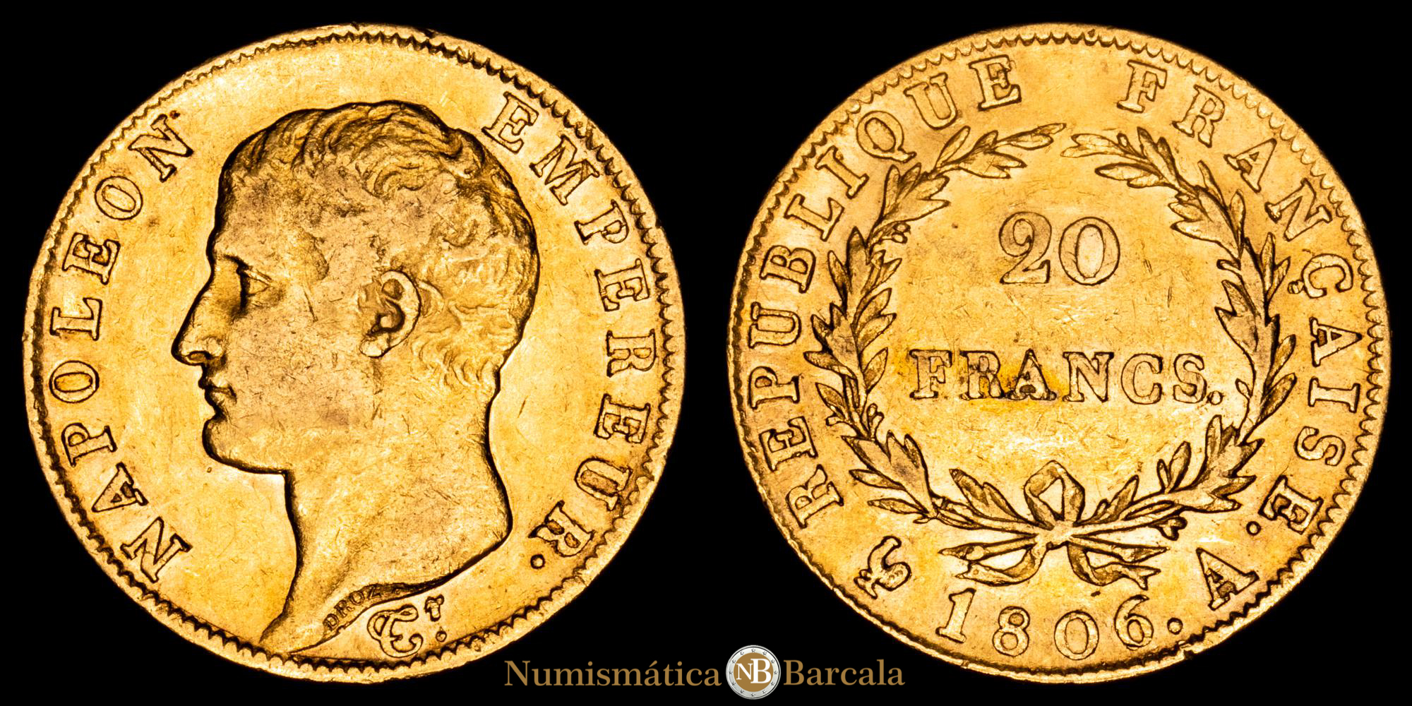 Napoleón I. 20 Francs. (6,42 g.). Paris-A. 1806. F-513/1. MBC+. Escasa