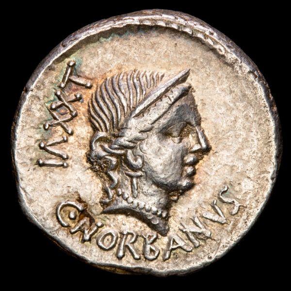 NORBANA. C. Norbanus. Denario (3,86 g.). Roma, 83 a.C. Anv.: Cabeza diademada de Venus a derecha, detrás número LXXVI. Leyenda: C. NORBANVS. Rev.: Fasces con hacha entre espiga y caduceo. Pátina y restos de brillo original. Ex Aureo. 2 Julio 1998, n. 63. Ex Colección Scipio . BMC-2770-26; Cal-1049; Craw-357/1b; FFC-943; Se-2. MBC+.