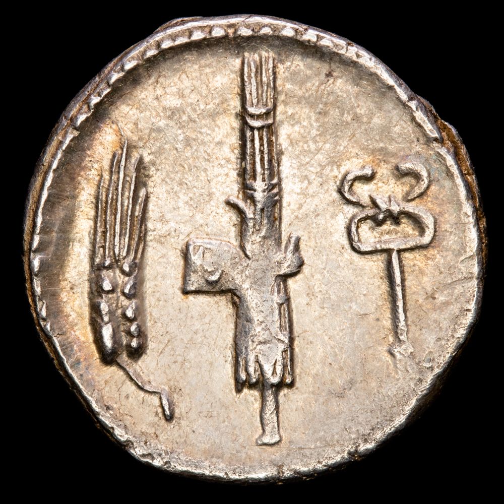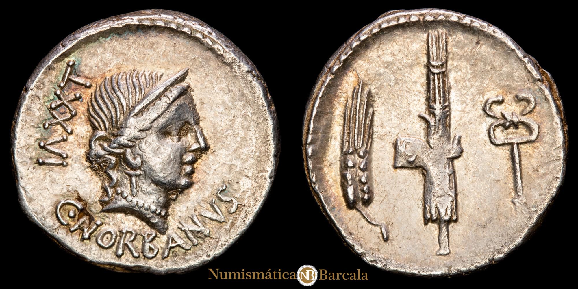 NORBANA. C. Norbanus. Denario (3,86 g.). Roma, 83 a.C. Anv.: Cabeza diademada de Venus a derecha, detrás número LXXVI. Leyenda: C. NORBANVS. Rev.: Fasces con hacha entre espiga y caduceo. Pátina y restos de brillo original. Ex Aureo. 2 Julio 1998, n. 63. Ex Colección Scipio . BMC-2770-26; Cal-1049; Craw-357/1b; FFC-943; Se-2. MBC+.