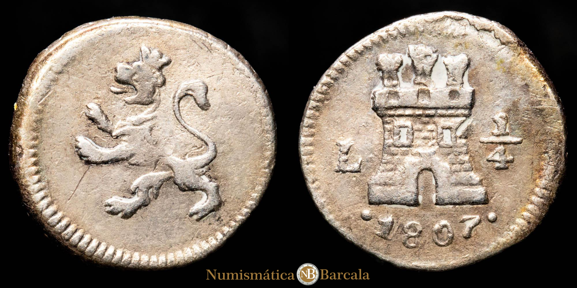 Numismática Barcala > Productos > Monarquia Española > Borbones > 1788-1808 Carlos IV > Perú – Carlos IV. 1/4 de Real. (0,83 g.). Lima. 1807. Aureo y Calicó – 1391. XF-40. Muy rara.
