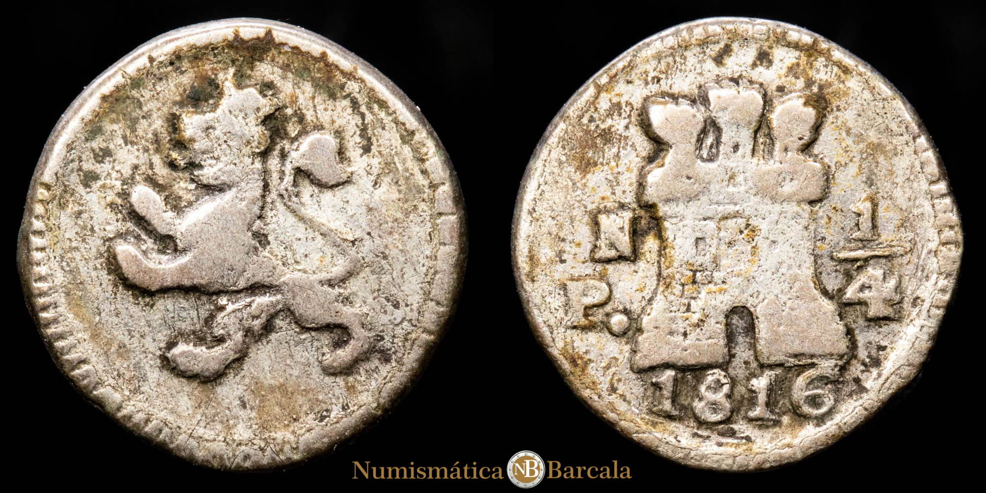 Numismática Barcala > Productos > Monarquia Española > Borbones > 1808-1833 Fernando VII > Perú – Fernando VII. 1/4 de Real. (0,72 g.). LIMA. 1816. Aureo y Calicó – 267. F-12. Escasa.