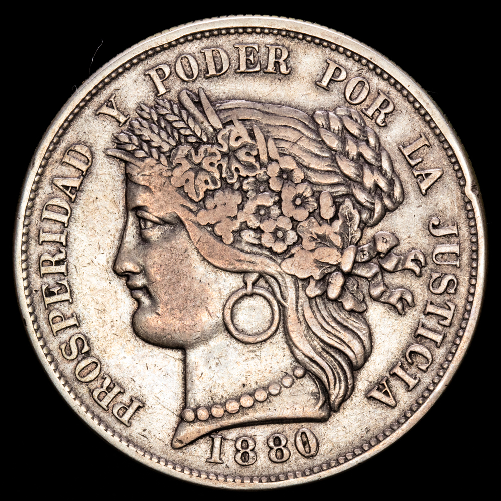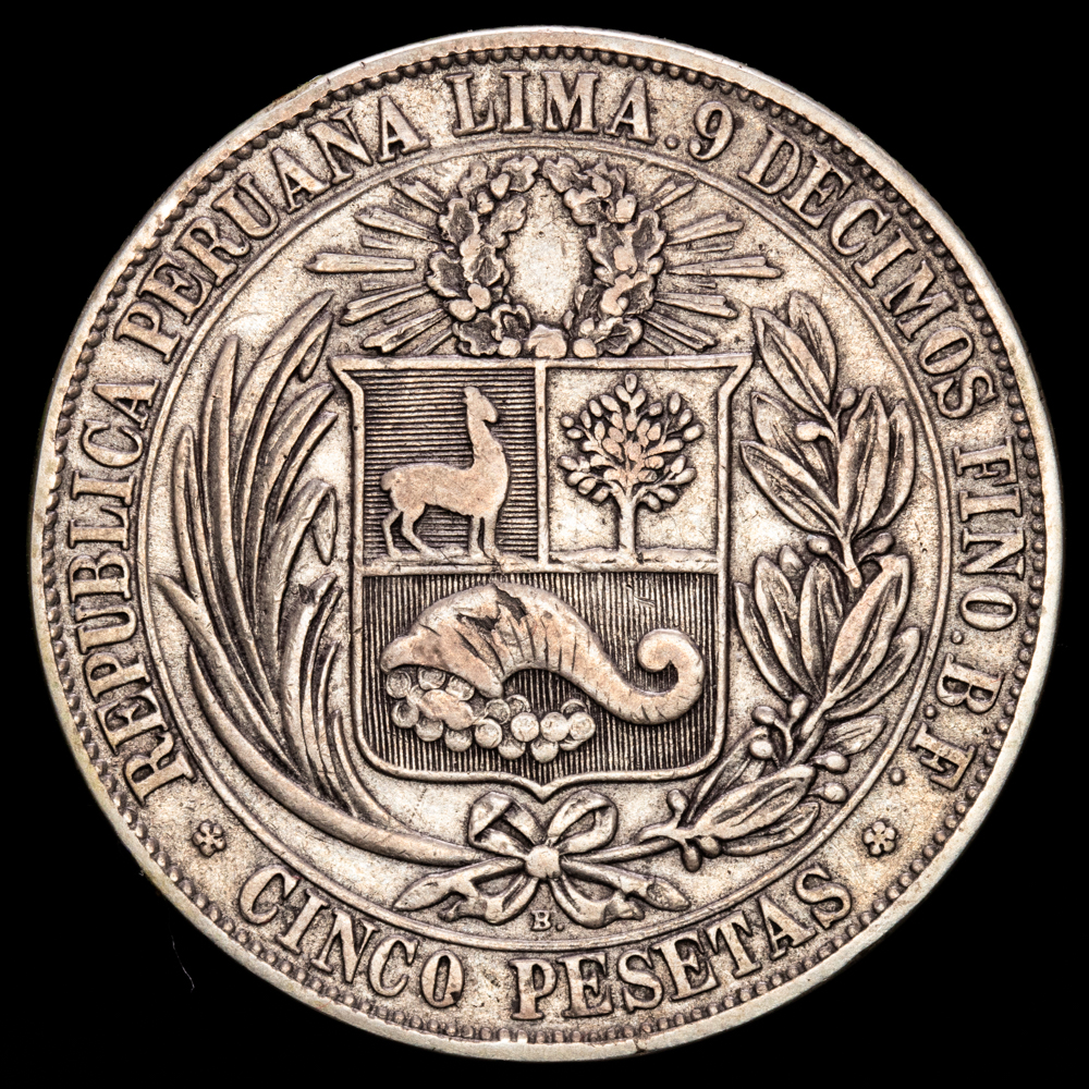 Perú – República. 5 Pesetas. (24,76g.). Lima. 1880. Ensayador BF. VF+.