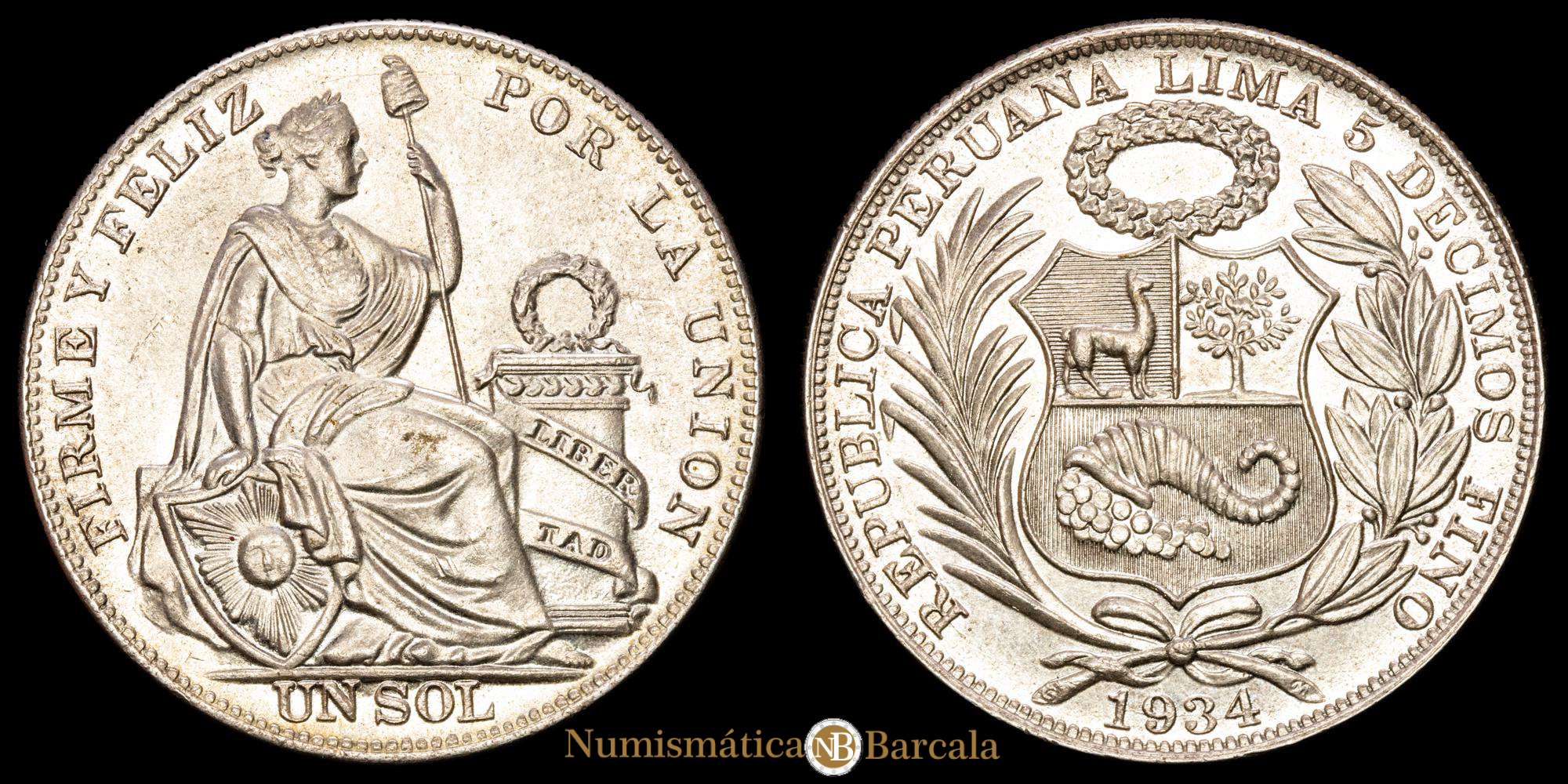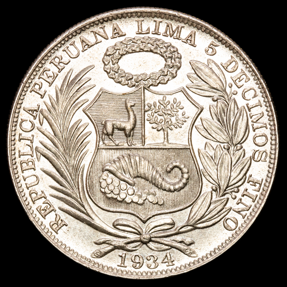 Numismática Barcala > Productos > Monedas Mundiales > America Sur > Perú > Perú. Sol. (25,13g.). Lima. 1934. . KM-218.2. . UNC.