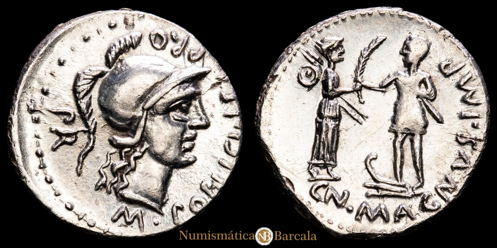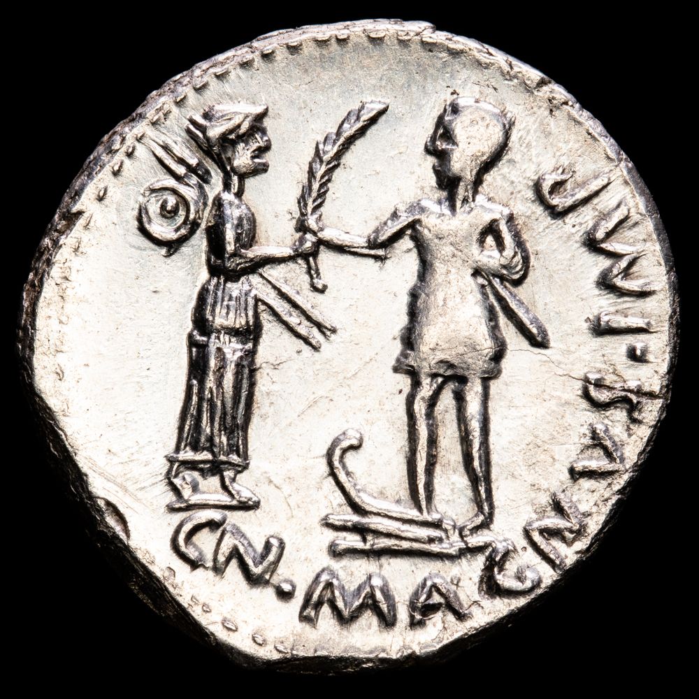 Numismática Barcala > Productos > Romanas > IMPERIO ROMANO > Pompeyo. Denario. (3,79 g.). Códoba. 46-45 a.C.. Craw-369/1a. UNC-. A: M POBLICIVS LEG PRO – PR / R: CN•MAGNVS•IMP