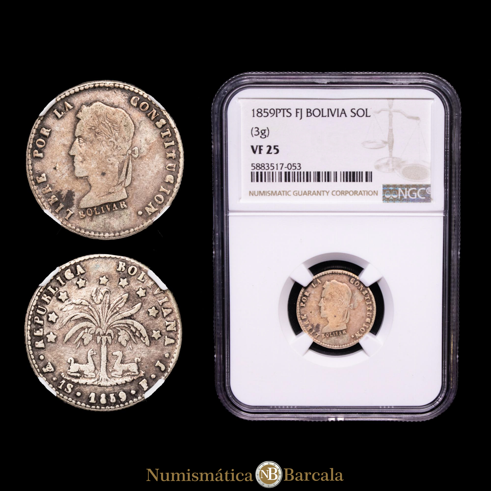 Bolivia. Sol. (3 g.). Potosí. 1859. Ensayador F·J. Encapsulado por NGC VF25.
