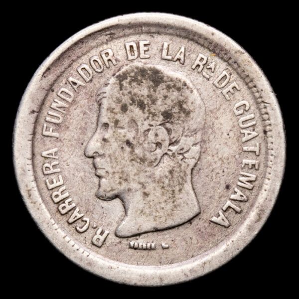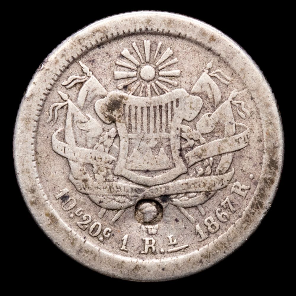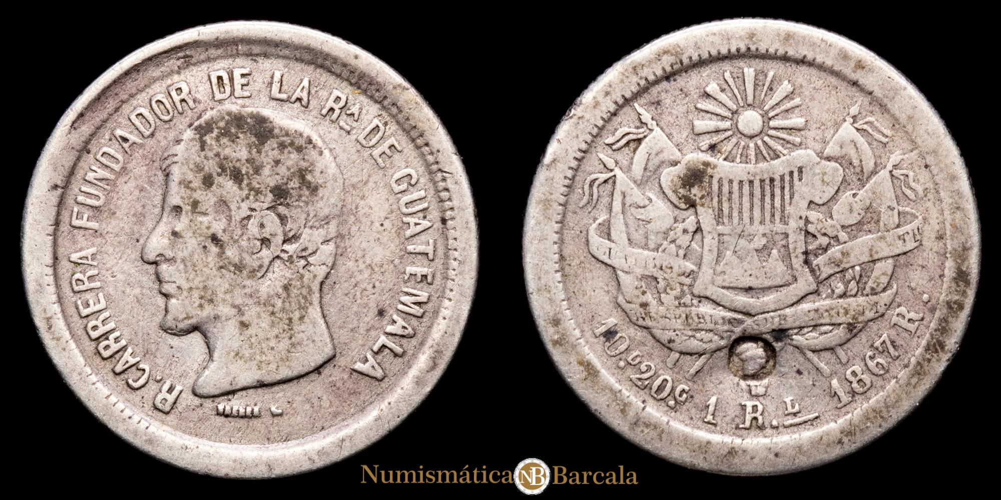 Numismática Barcala > Productos > Monedas Mundiales > América Central > Guatemala > República de Guatemala – 1 Real (2,84 g.). Guatemala. 1867-R. Ensayador R. KM-141. F. Con contramarca.