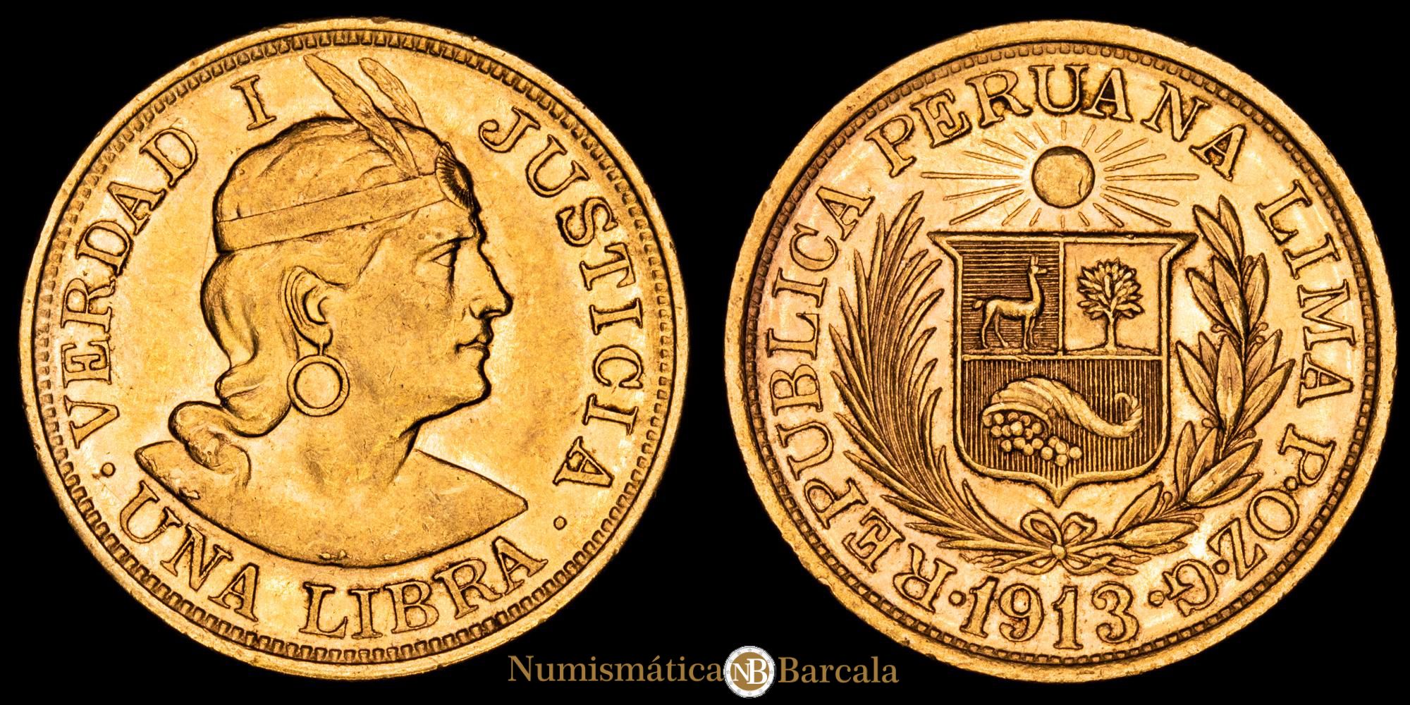 Numismática Barcala > Productos > Monedas Mundiales > America Sur > Perú > República de Perú. 1 Libra (7,97 g.). Lima. 1913. Ensayador P.O.ZG. KM-207. UNC-. Brillo original.