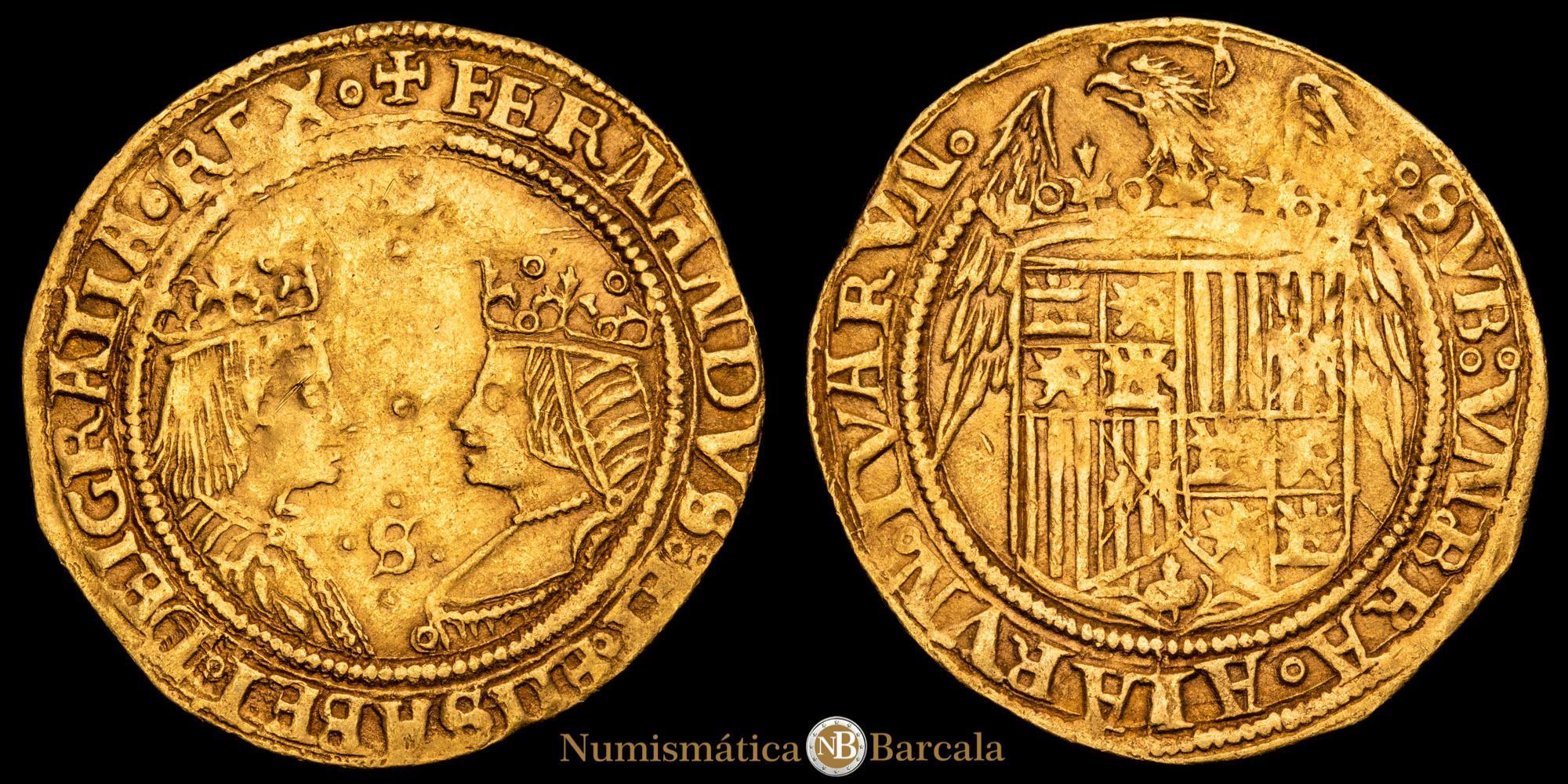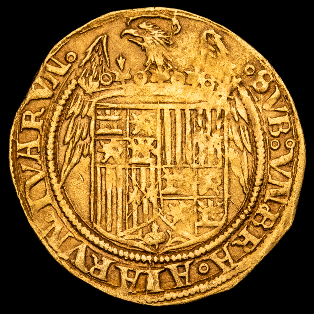 Anv: +FERNANDVS.ET·ELISABET.DEIGRATIA.REX Rev: SVB:VMBRA:ALARVM:TVARVM.