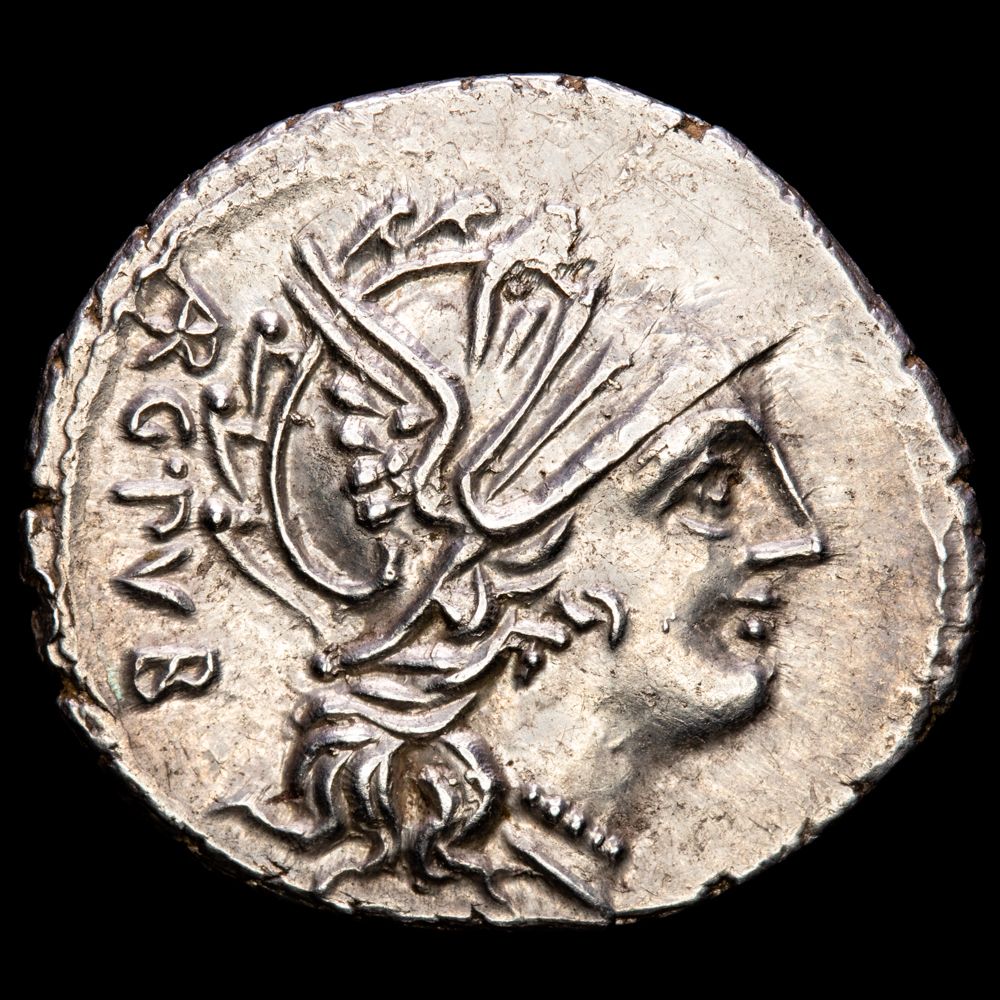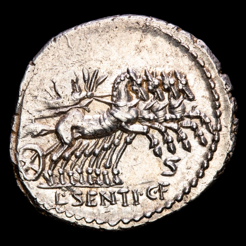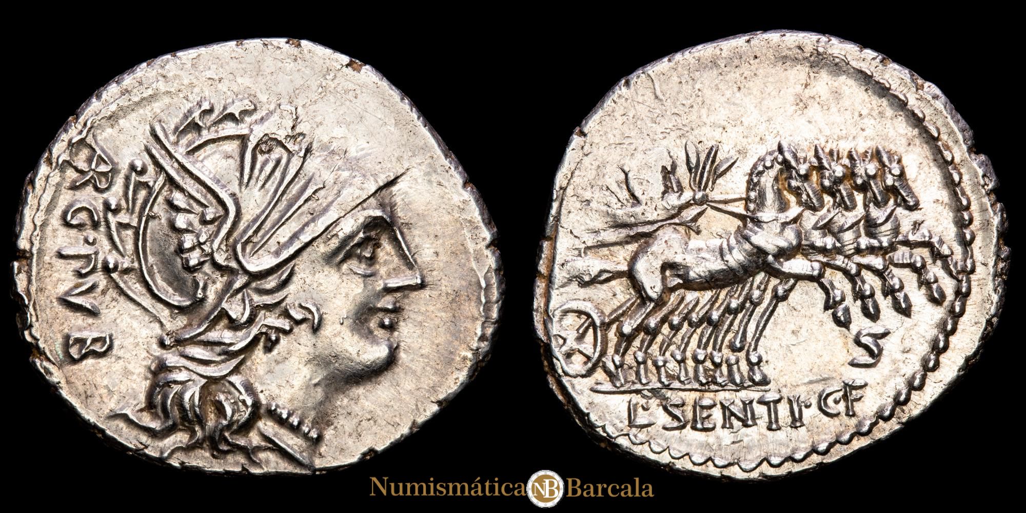 Numismática Barcala > Productos > Romanas > REPÚBLICA > SENTIA. Lucius Sentius C.f. Denario (3,91 g.). Roma, 101 a.C. Anv.: Cabeza de Roma a derecha, detrás ARG. PVB. Rev.: Júpiter con cetro y haz de rayos en cuadriga a derecha, debajo letra S. En exergo: L. SENTI. C.F. Brillo original. BMC-1651-59; Cal-1257; Craw-325/1b; FFC-1108; Se-1. EBC+.