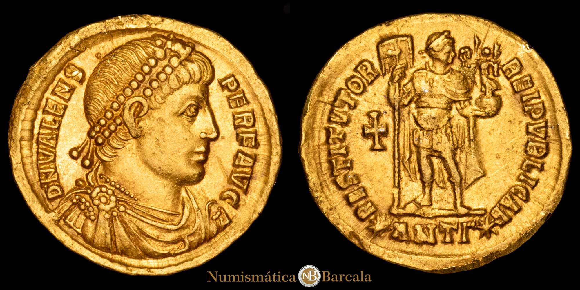 D N VALENS PER F AVG, busto de Valens con diadema de perlas, vestido y acorazado a la derecha, visto de frente.