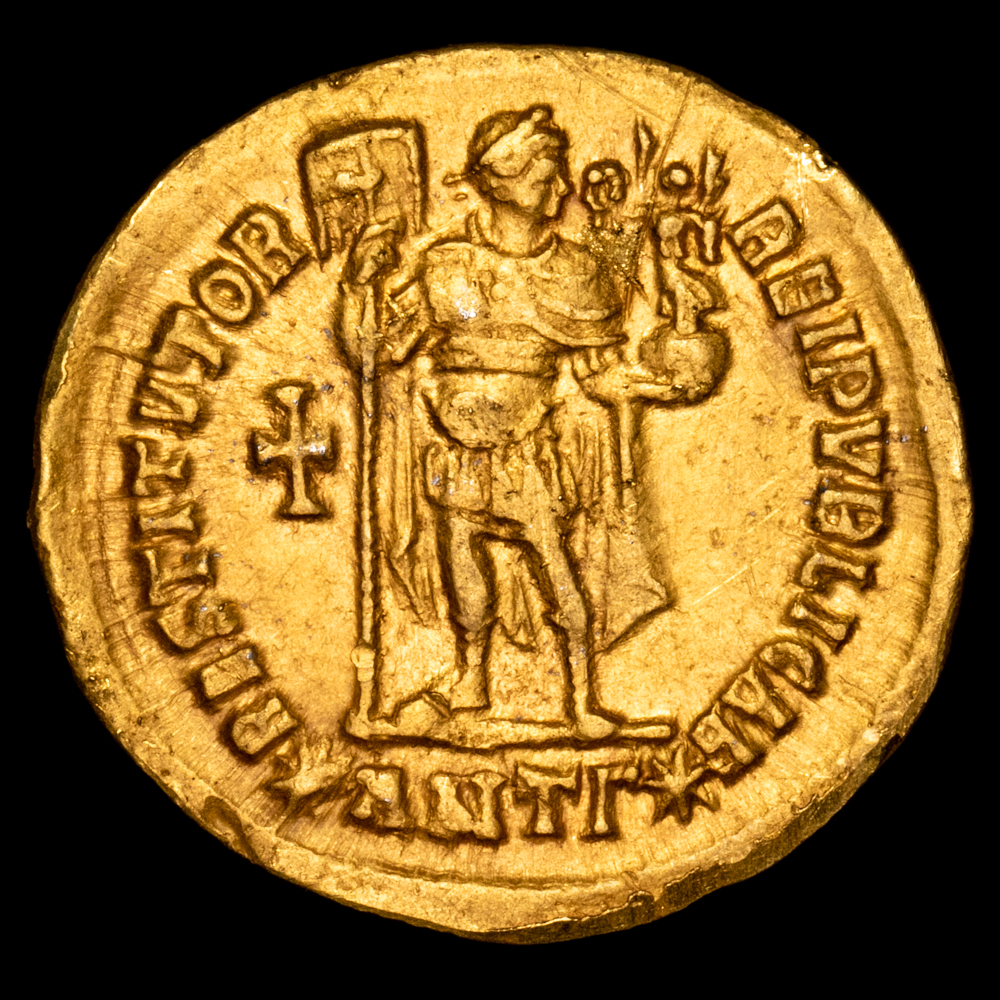 RESTITVTOR REIPVBLICAE, emperador de pie de frente, cabeza laureada a la derecha, lábaro con cruz en el estandarte en la mano derecha, Victoria en el globo a la izquierda; cruz en campo izquierdo, estrella ANTΓ estrella en exergo.