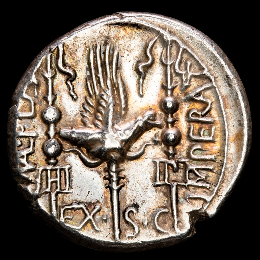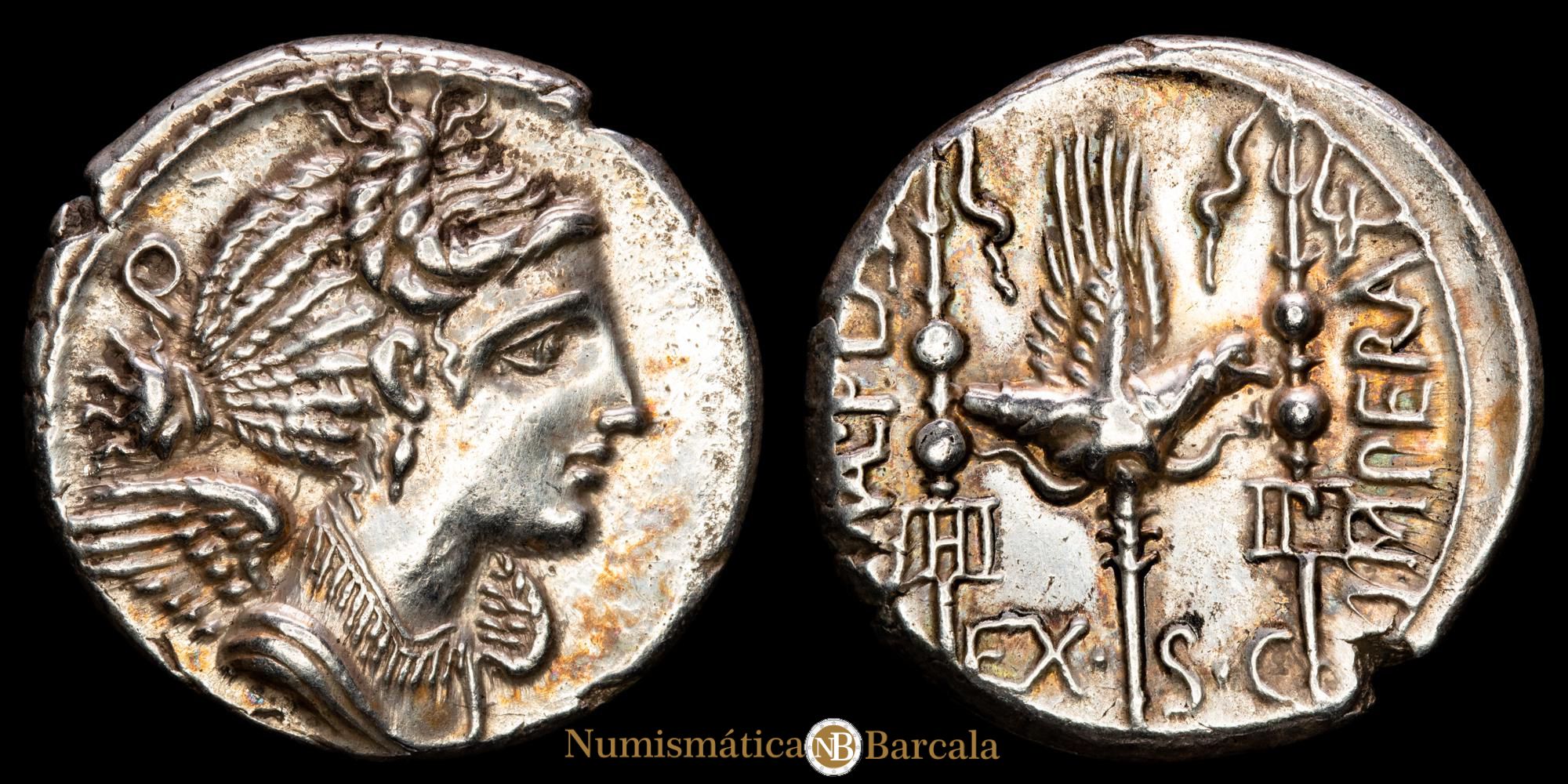 Numismática Barcala > Productos > Romanas > REPÚBLICA > Valeria. Denario (3,87 g.). Galia, 82 a.C. Craw-356/1B. XF+. Águila legionaria entre dos estandartes.