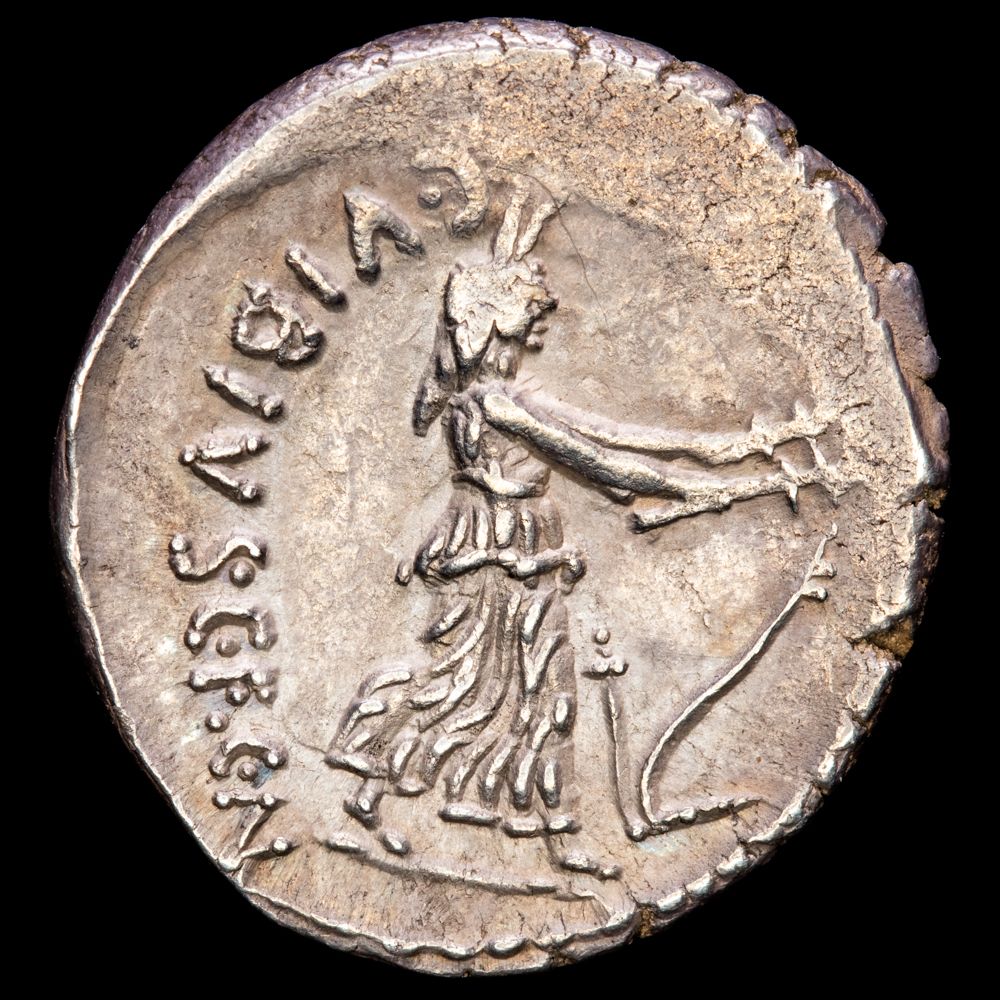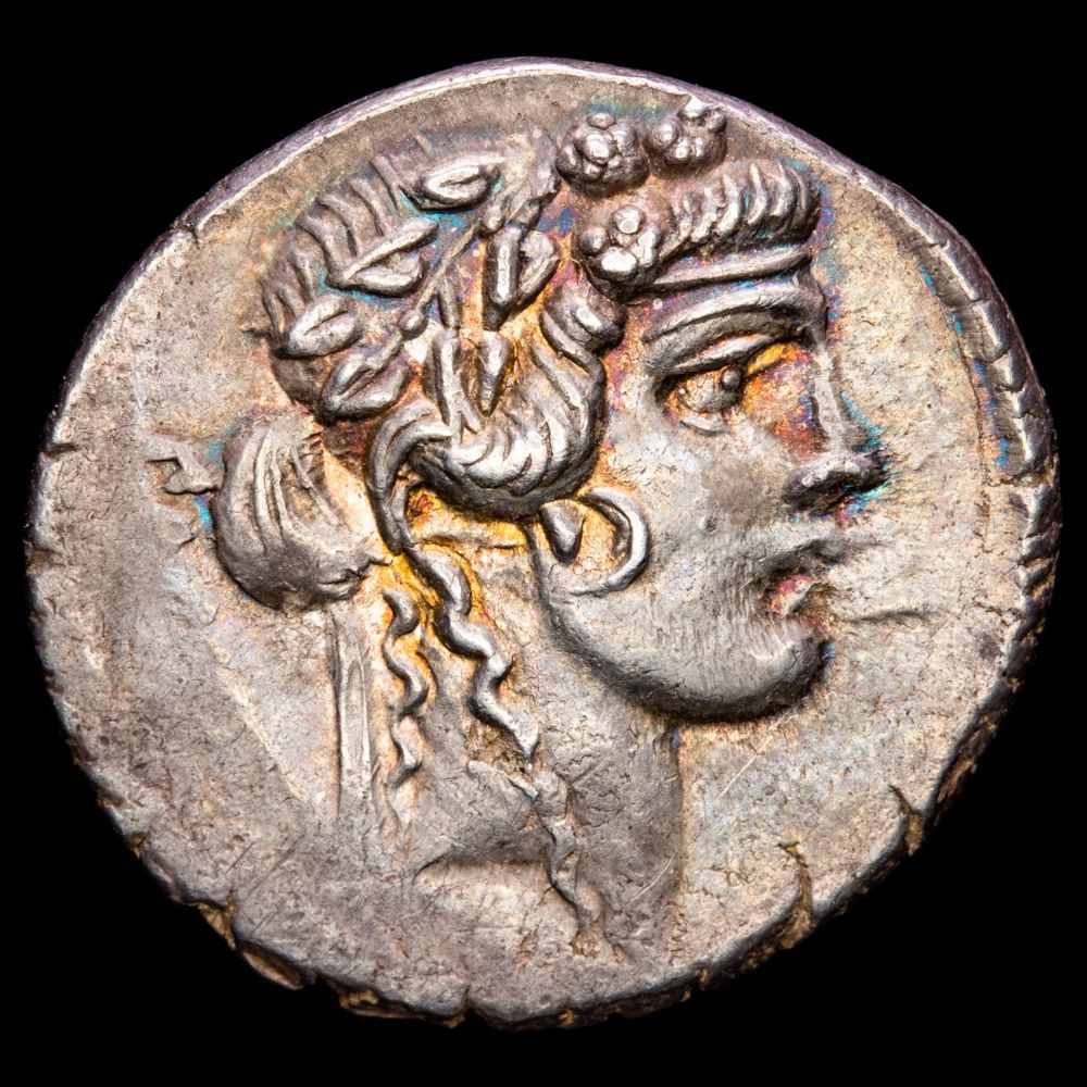VIBIA. C. Vibius C.f.C.n. Pansa. Denario (4,07 g.). Roma, 48 a.C. ESCASA. Anv.: Cabeza de Baco a derecha, detrás (PANSA). Rev.: Ceres de pie a derecha con dos antorchas, delante arado, detrás C. VIBIVS. C. F. C. N. BMC-3976; Cal-1369; Craw-440/2; FFC-1216; Se-16. EBC.