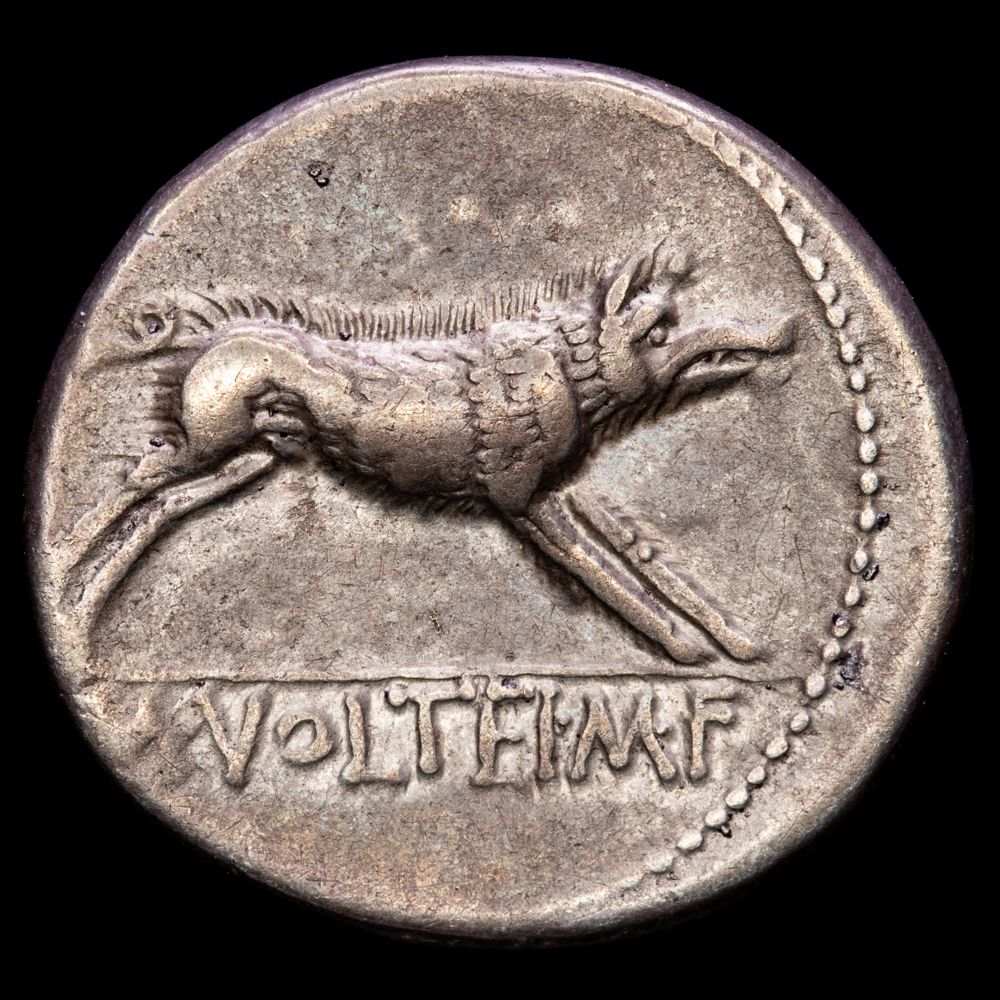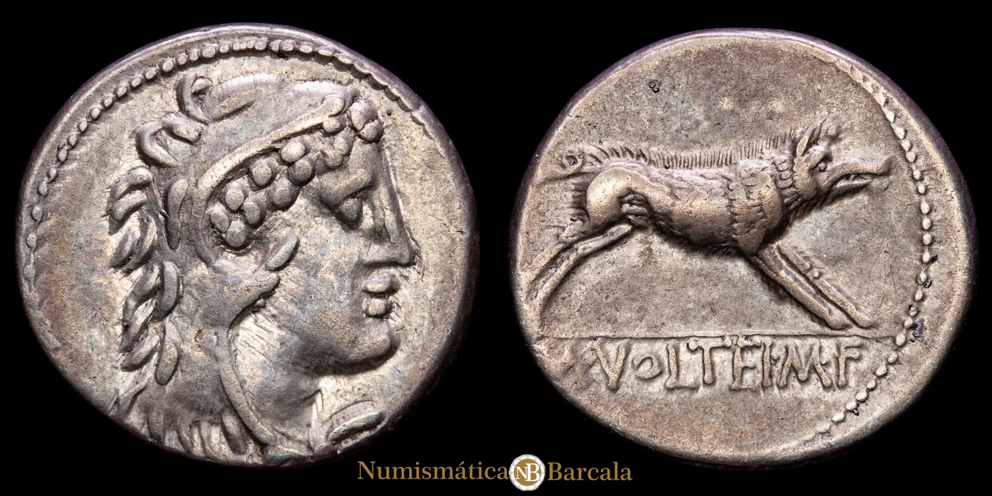 VOLTEIA. M. Volteius M.f. Denario (3,79 g.). Roma, 78 a.C. Anv.: Cabeza de Hércules joven a derecha. Rev.: Jabalí a derecha. En exergo: M. VOLTEI. M. F. BMC-3158; Cal-1395; Craw-385/2; FFC-1233; Se-2. MBC+.
