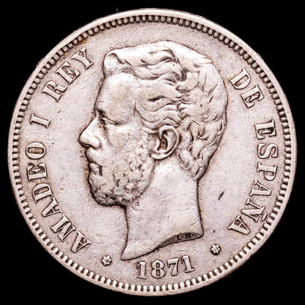 Amadeo I. 5 Pesetas. (24,92 g.). Madrid. 1871*18-73*. Ensayador DE·M. AC-3. MBC+. Rara.
