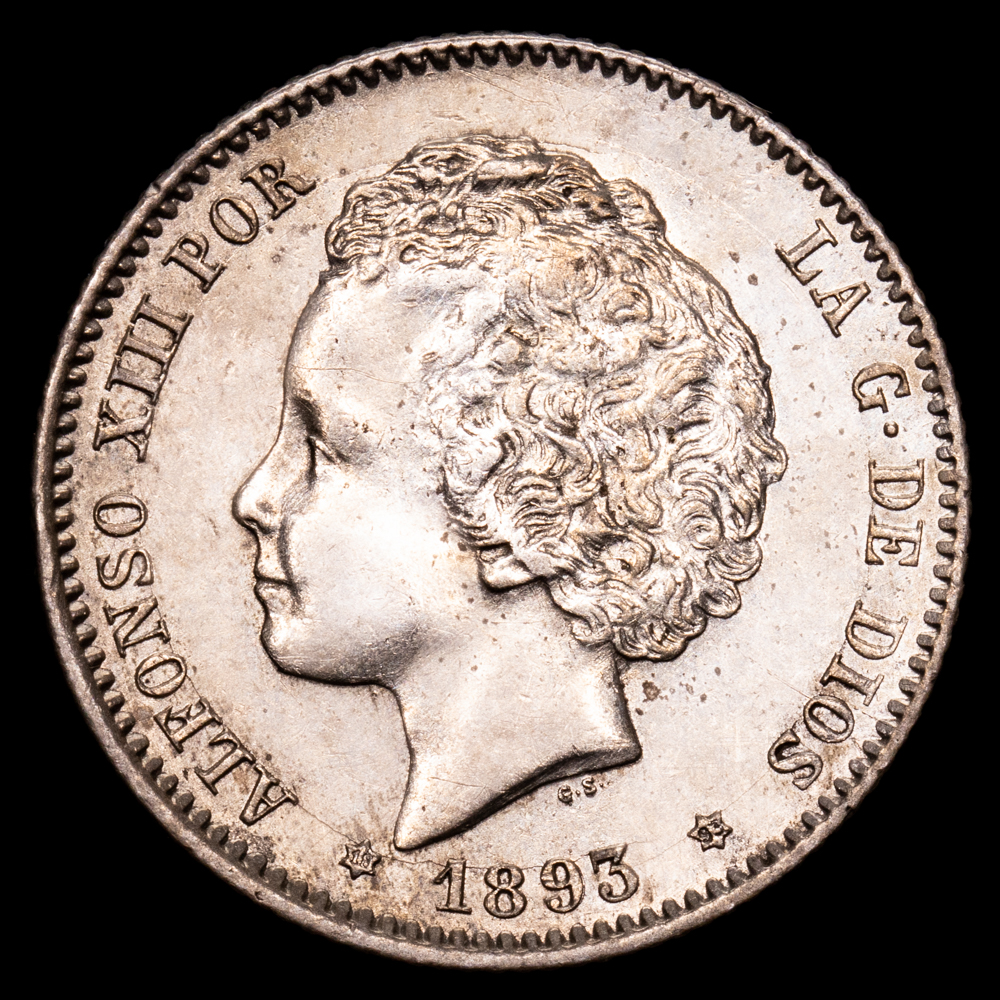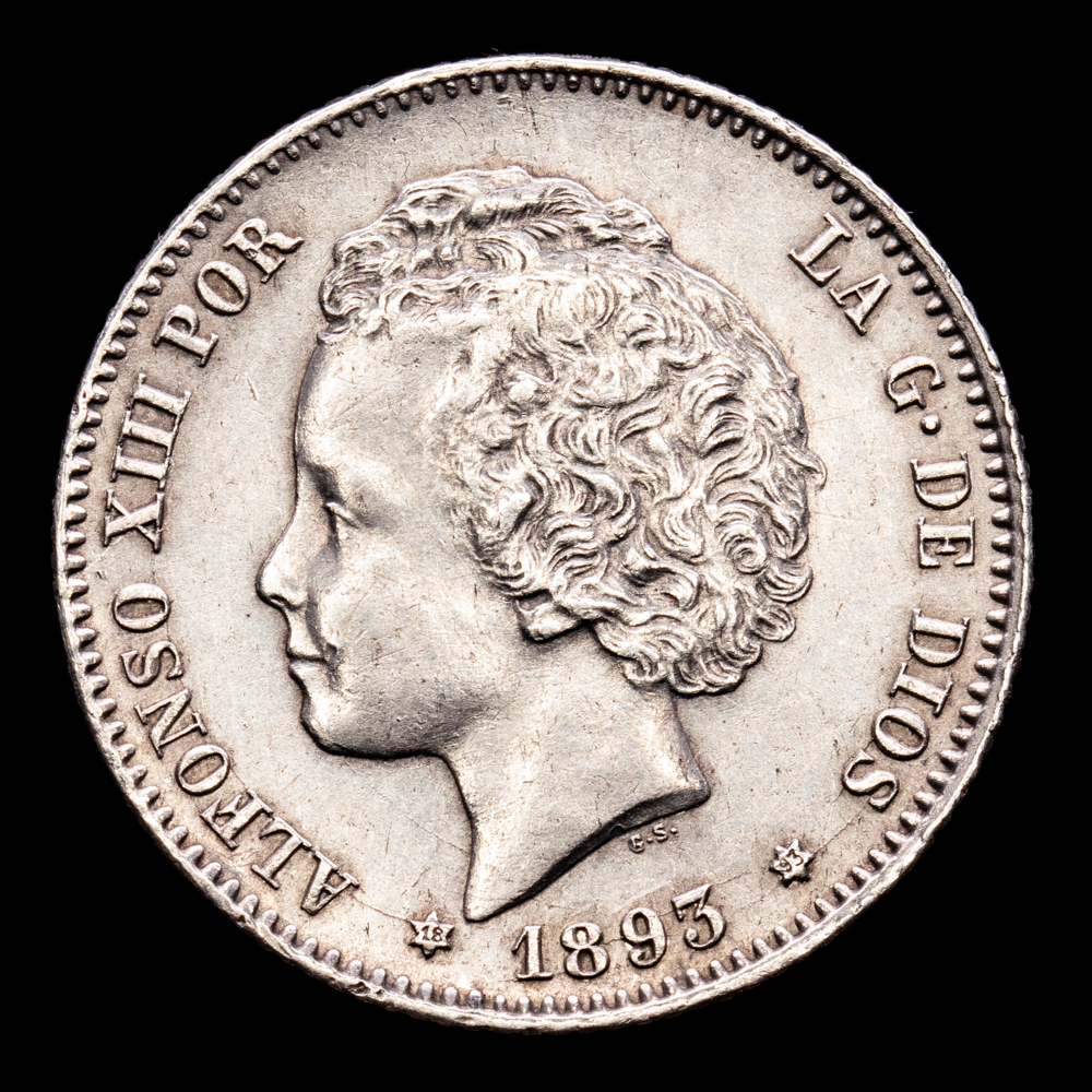Alfonso XIII. 1 Peseta. (4,93 g.). Madrid. 1893. Ensayador PG·L. Aureo y Calicó – 102. EBC-.