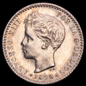 Alfonso XIII. 50 Céntimos (2,45 g.). Madrid. 1896 *9-6*. Ensayador PG·V. AC-44. UNC. Patina. Restos de brillo original.